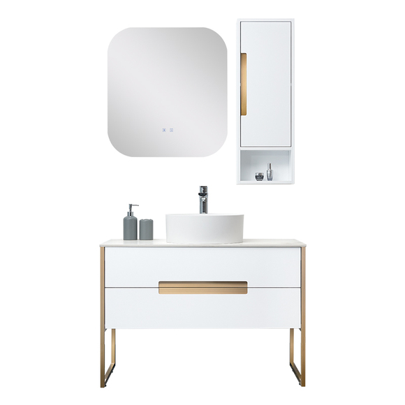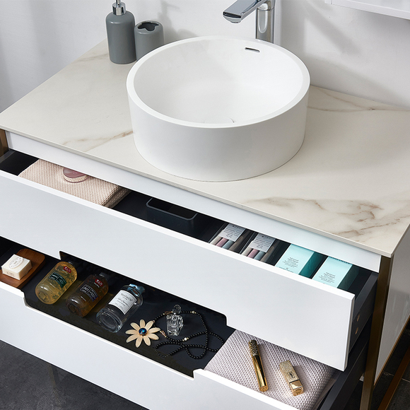 實木多層板,層層精工,防水防潮;304不銹鋼柜腳,防腐防銹;巖板臺面,優質亞克力臺上盆,易潔美觀;靜音液壓滑道,輕松緩沖。