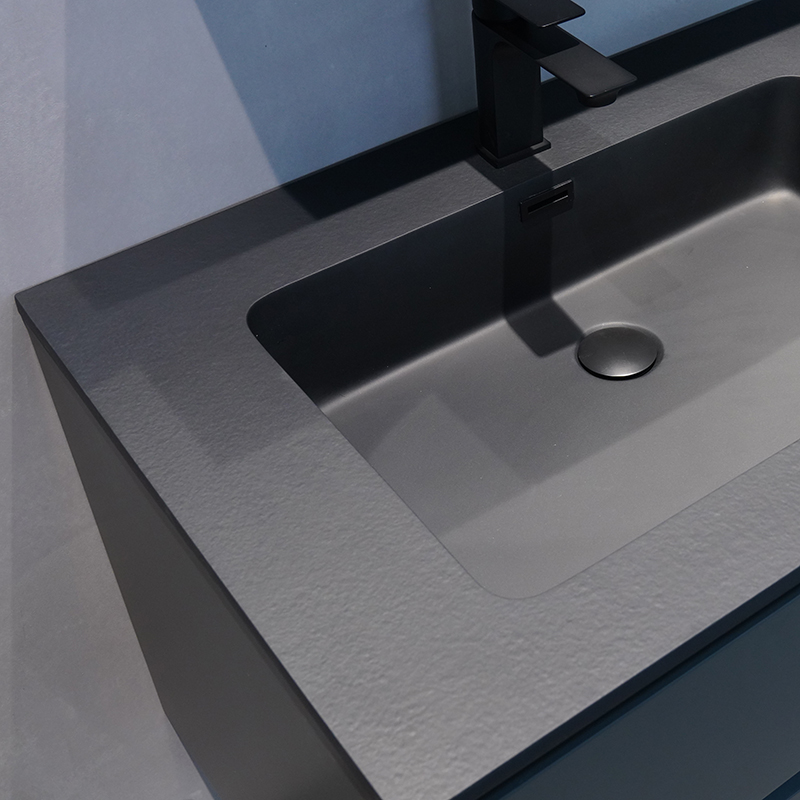 微晶石一體成型的黑色臺(tái)盆,臺(tái)面黑色火燒石紋理,盆芯亮光,持久耐用。